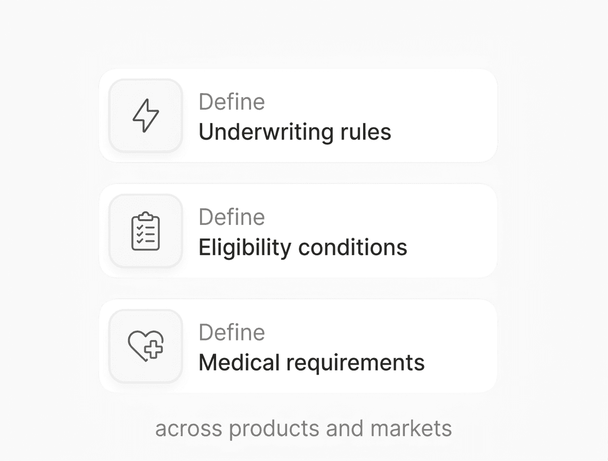 Define underwriting rules, eligibility conditions, and medical requirements across products and markets.